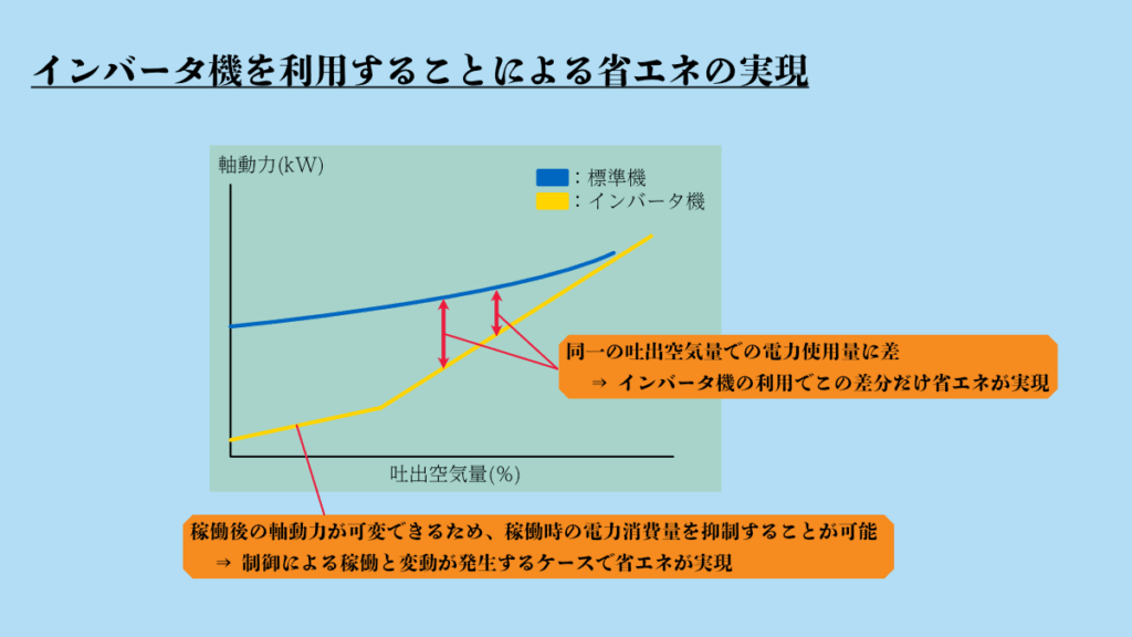 インバータ制御により稼働後の軸動力を可変することが可能なインバータ機は、標準機と比較して稼働時の電力消費量を抑制することができます。