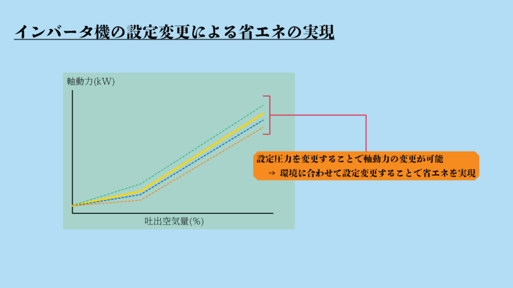 このエアーコンプレッサが消費する電力を減らすことで工場の電気代を削減することが可能となるのです。
