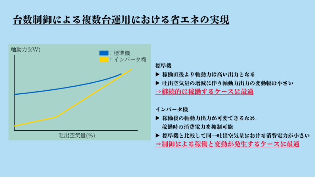 このように複数台運用を行っているケースでは標準機およびインバータ機それぞれの特徴を生かした運用を行うことが省エネの実現に繋がります。